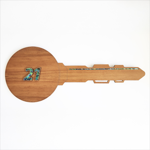 Crafted from native Rimu veneer on a strong natural plywood base, this timeless design features a clean circular head with the number “21” inlaid with shimmering Pāua shell for a uniquely New Zealand touch. A subtle strip of Pāua shell runs along the shaft, adding elegance and colour.