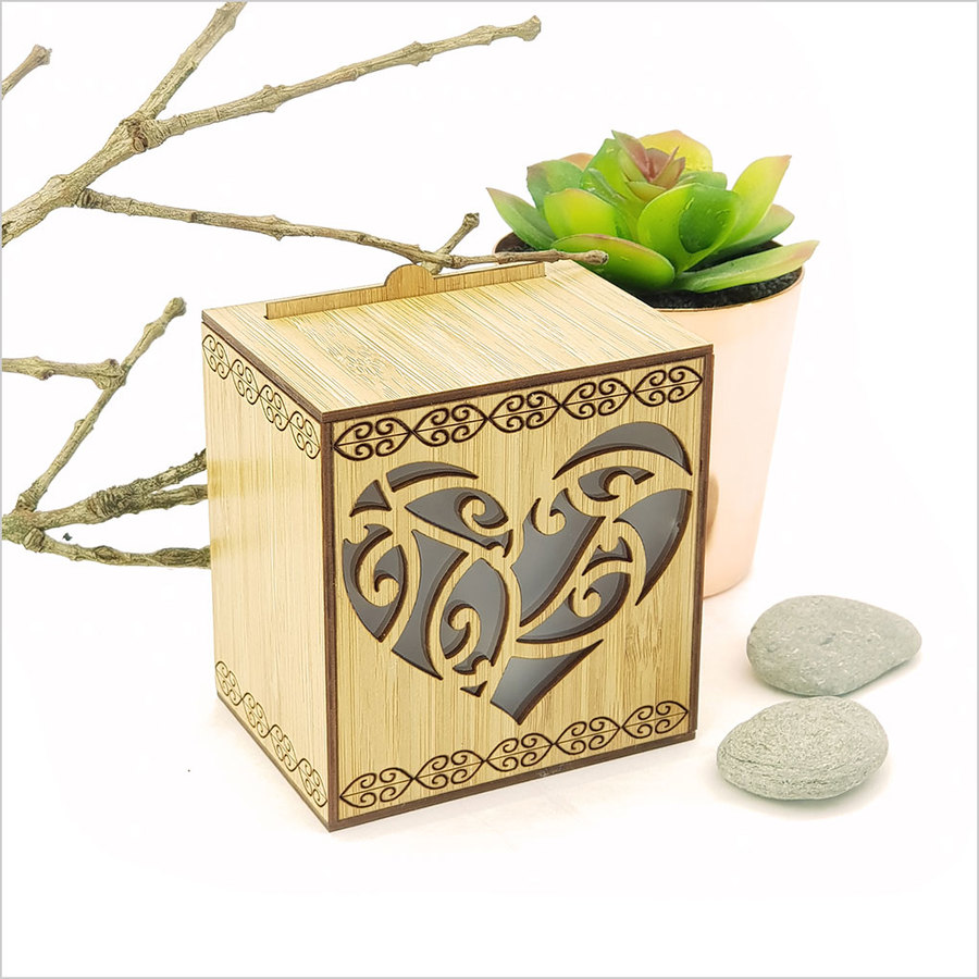 | ❤ Laser cut renewable bamboo veneer and specially developed acrylic for LED lights ❤ Comes with LED tealight candle (7 colour changing) ❤ It can also be hung on the wall (comes with key hole) ❤ Size: 80mm x 60mm x 85mm |