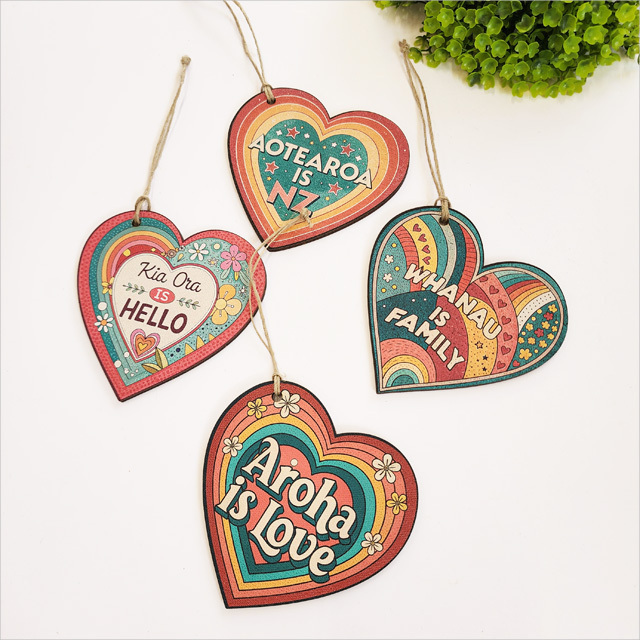 Share the spirit of Aotearoa with these vibrant heart-shaped decorations. Printed and laser cut from textured 3mm thick board, they are both sturdy and full of charm. Designed and proudly produced in Aotearoa, New Zealand, each heart carries a meaningful message in colourful, retro-inspired style.